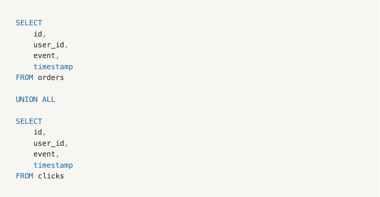For example, imagine you have two events tables. One is called orders which logs a row every time a user orders something on your website. Another is called clicks which logs a row for every click on your website. We want to understand how many users are getting through each step of the process, from clicking an item, to adding it to a cart, to completing an order. The goal is to identify the step(s) in the user journey where we're losing most customers and take some action to encourage users to go to the next step (e.g. by re-designing a page or creating an email campaign for users at the drop off step).